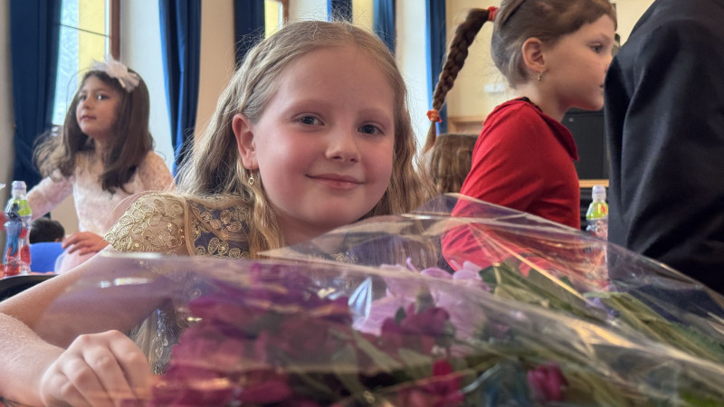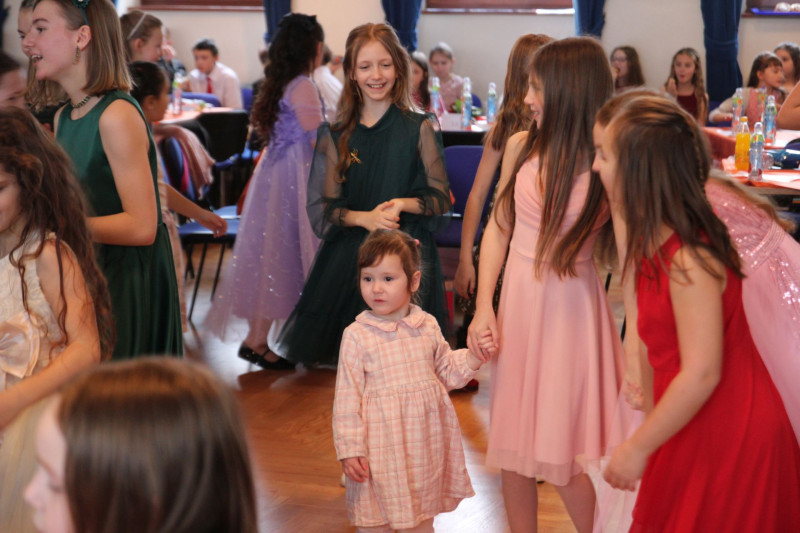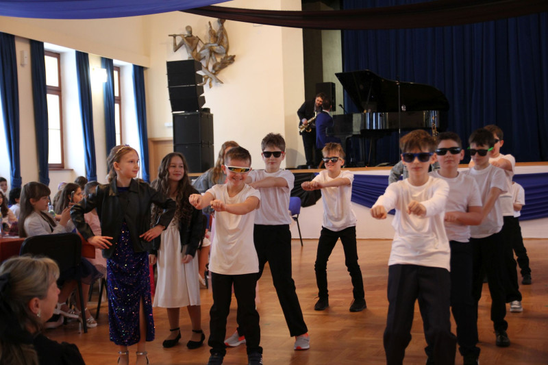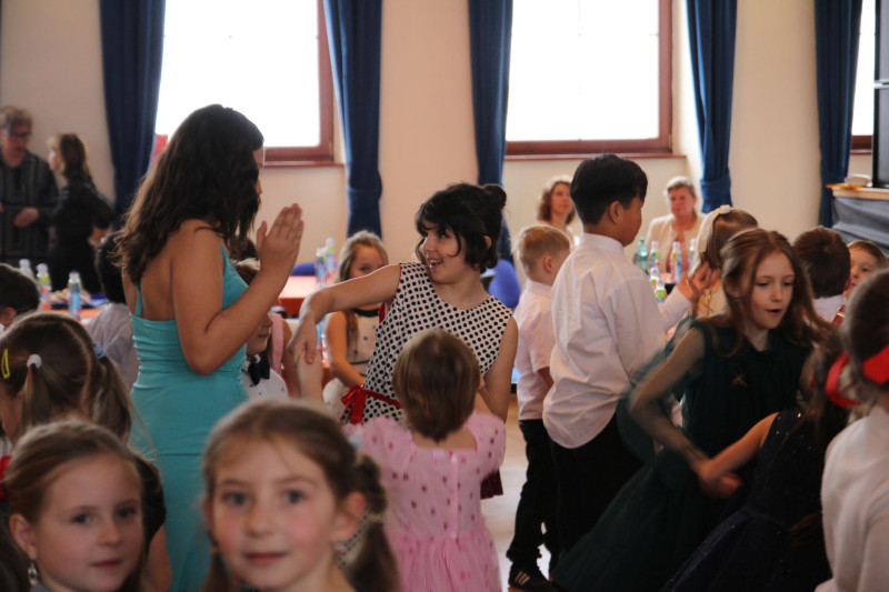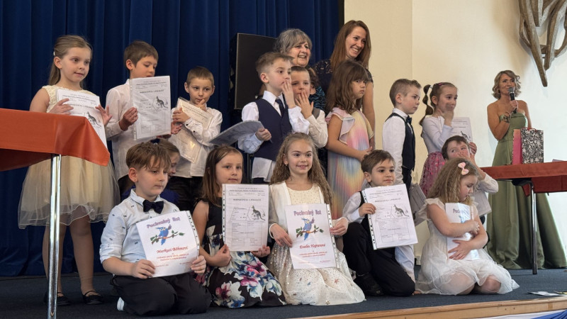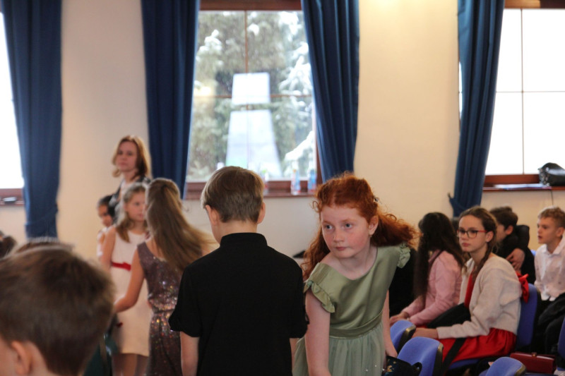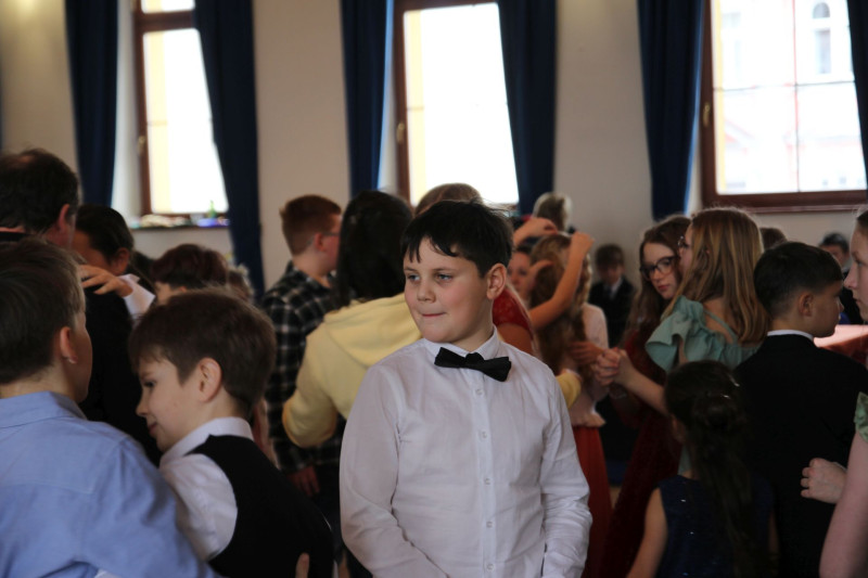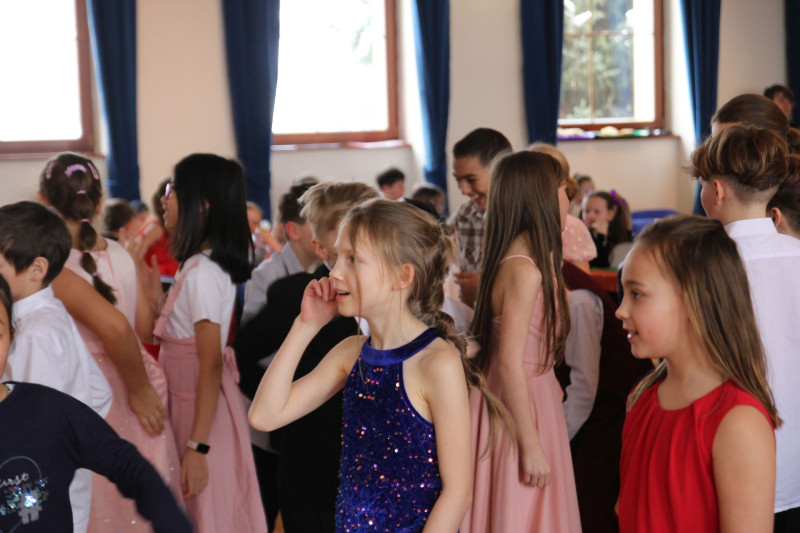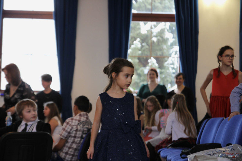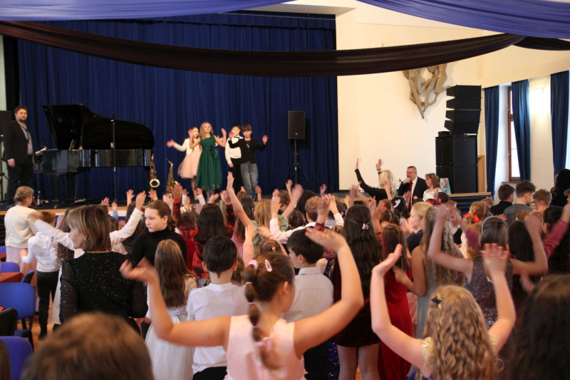 V sále se to jen hemžilo malými gentlemany v košilích a mladými dámami v nádherných šatech. Všichni přítomní byli neuvěřitelně vyfiklí a elegantní, což dodalo celému odpoledni neopakovatelný šmrnc. Vrcholem programu bylo slavnostní předávání pololetního vysvědčení, které si děti v tomto noblesním prostředí náležitě užily.